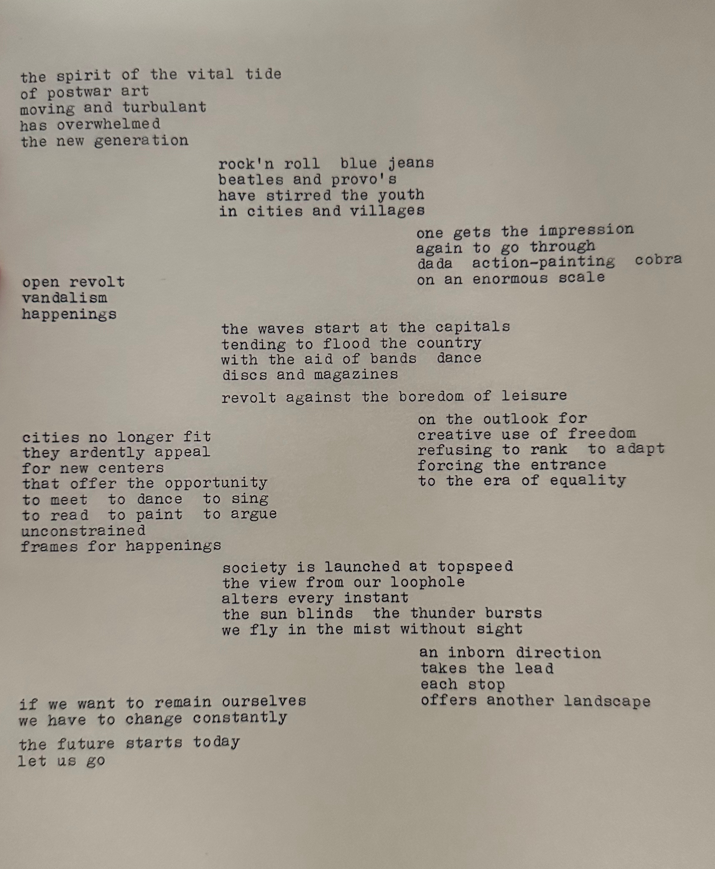 If we want to study our urban environment, the industrial world in which we live, and if we want to change that world, if we want to change the way we live and the environment in which we live, then we have to realise, that we engage in collective creativity, in an activity that is at the level of art, in culture. The state of culture at the moment, the decomposition of the individual art forms, the apparent impossibility of renewing or even continuing these art forms, create a void in which this work emerges as an urgent necessity. The demise of natural life forms, and the ever stricter organisation and mechanisation of society, have greatly reduced the possibilities for individual expression, for play, for creativity. Our refusal to continue to accept this state of affairs, to adapt the existing culture to it, leads us to find new forms of play and creativity, but at the same time we are forced to rethink the whole concept of culture, and finally to another, new conception of culture, of play, of building up our sphere of life. (my translation)